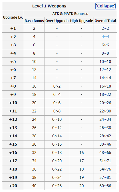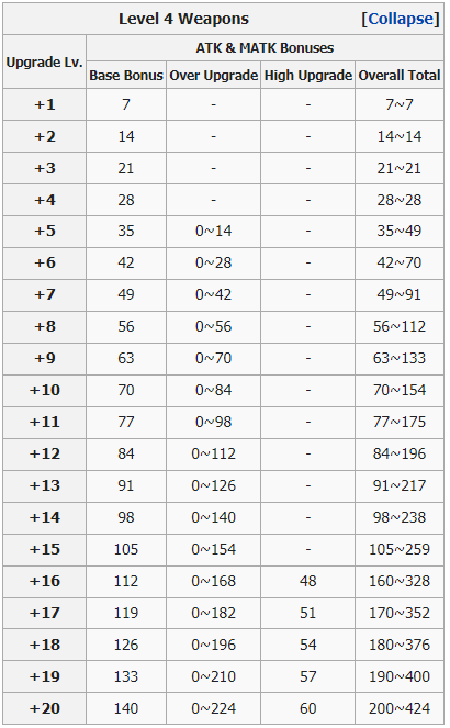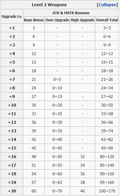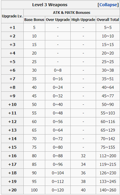 16 High Upgrade ATK จาก +15 ถึง +16 และ 1 ATK สำหรับทุก ๆ การอัพเกรด High ผ่าน +16